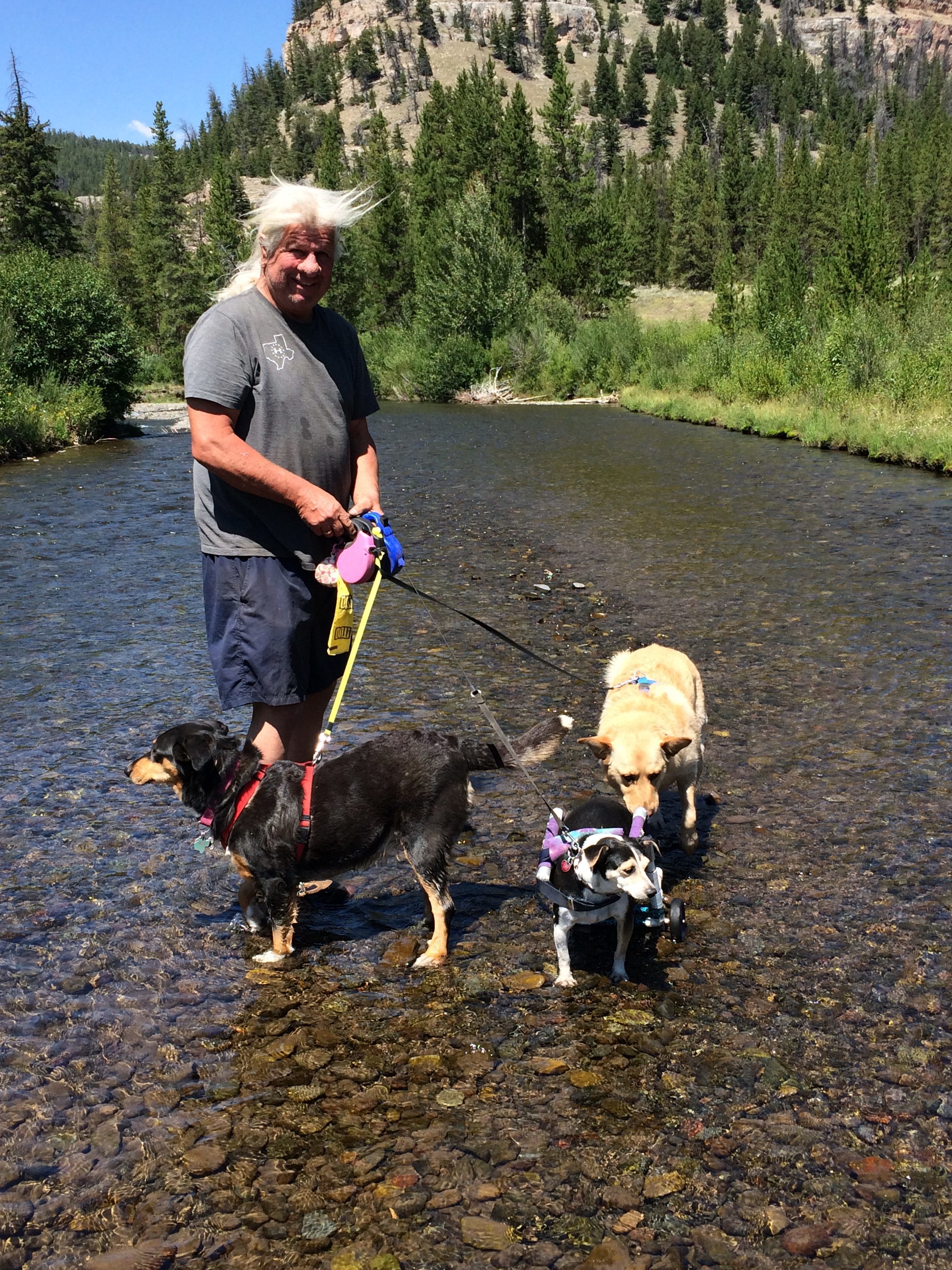 IMG_1081 ← Previous Next → Larry in the Shoshone river with Molly, Ellie and of course, Nike our little cart dog! P.S. They all crossed without help!
